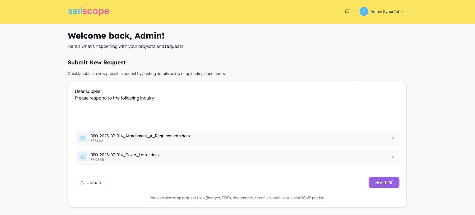 Simply describe customer request (or upload files received from the customer) on the app home page and click upload