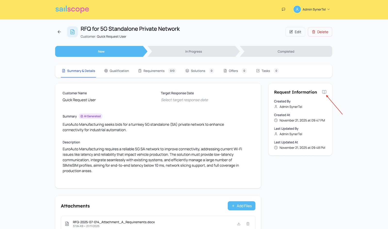 Upon request creation - our AI Service performs inquiry summarisation - extracting key information from the attached files.