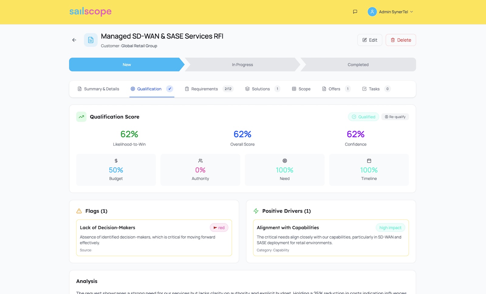 The result of qualification can be used as a suggestions to pre-sales teams highlighting strengths and potential issues, however it can also be used as a gate and probability evaluator in the funnel analytics.