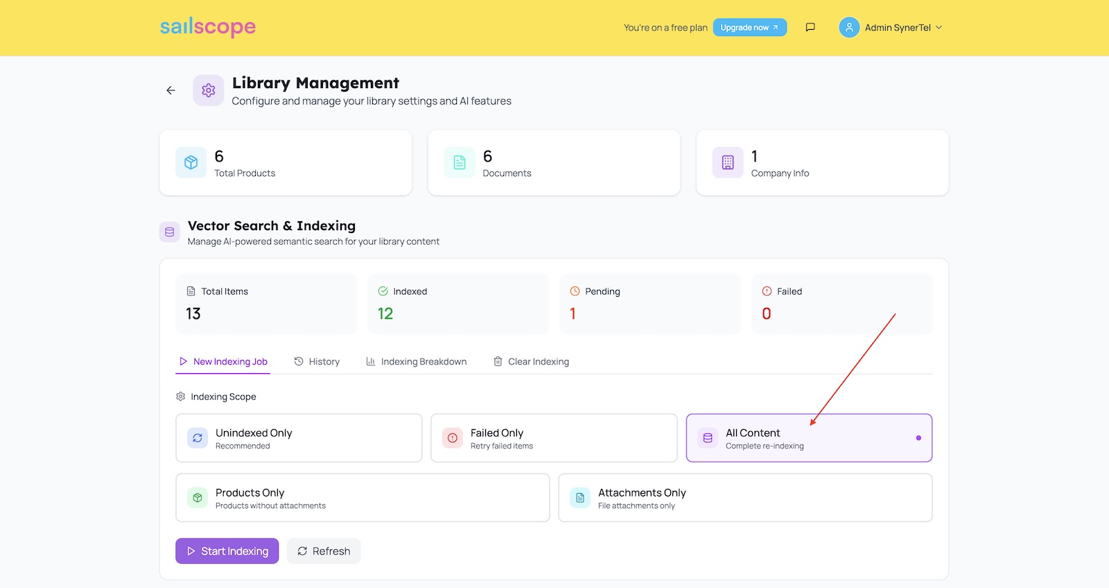 Next, go to Library tab and click Library Management. Company and Product Information that you have defined earlier need to be indexed in a vector database to build the Sailscope’s knowledge graph. To start the indexing job - select All Content option and click Start Indexing.